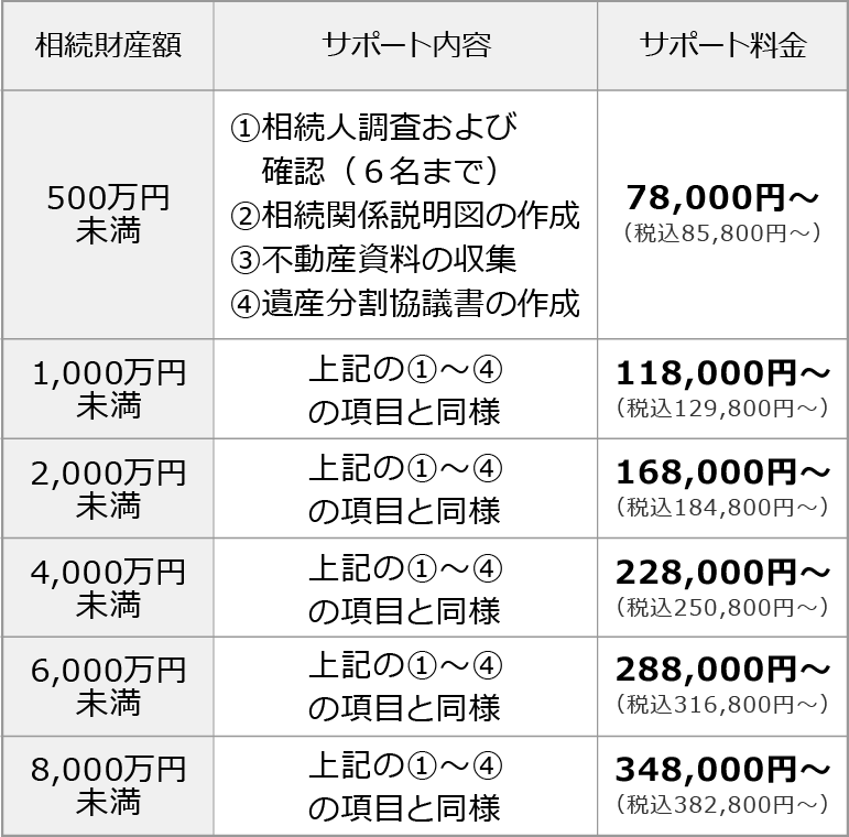 - 本サポートでは、行政書士として「出生から現在までの戸籍謄本の収集」「相続関係説明図の作成」「不動産資料の収集(評価証明等の取得)」「遺産分割協議書の作成」を担当させていただきます。