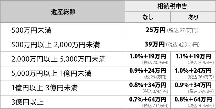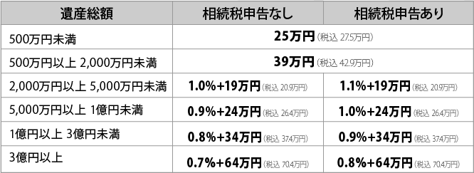 - 相続人が5名以上いる場合など、明確に業務量が増える場合につきましては加算があります。担当者にご確認下さい。